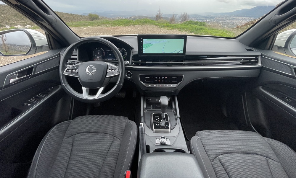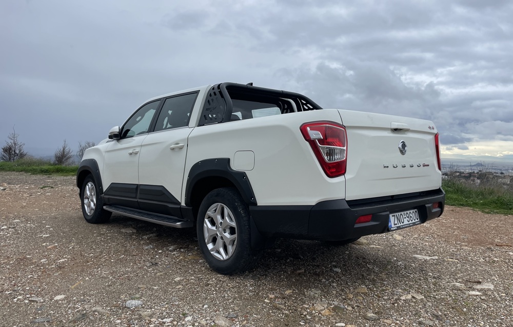 Σε επαρχιακούς δρόμους με στροφές, το Musso Grand δεν κρύβει τον όγκο και το βάρος του, όμως το τιμόνι έχει σωστή αίσθηση, ειδικά στο sport mode.