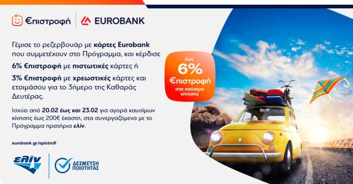 Από την Παρασκευή 20 έως και τη Δευτέρα 23 Φεβρουαρίου, επισκεφθείτε ένα από τα πρατήρια ελίν που συμμετέχουν στο Πρόγραμμα €πιστροφή της Eurobank, ανεφοδιάστε το όχημά σας με καύσιμα κίνησης ελίν και κερδίστε έως 6% €πιστροφή.