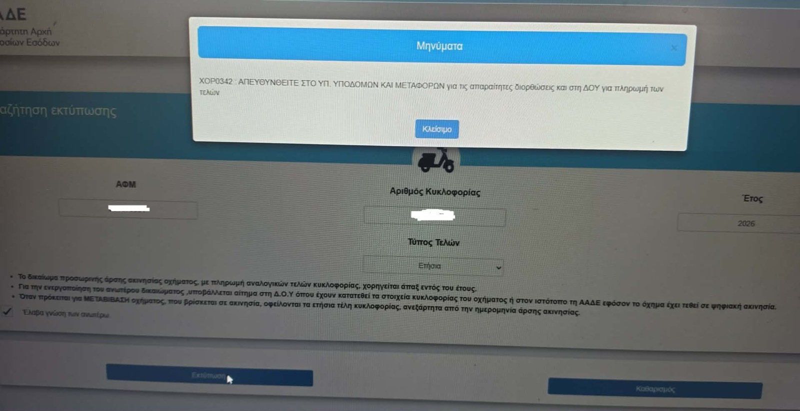 Εδώ ακριβώς εντοπίζεται και το μεγάλο πρόβλημα καθώς στους αγοραστές νέων ΙΧ ή μοτοσυκλετών που το ΑΦΜ τους ανήκει σε Περιφέρεια διαφορετική από εκείνη που είναι ο τόπος παράδοσης του οχήματος το σύστημα δεν εμφανίζει την εξόφληση των Τελών Κυκλοφορίας και όπως μπορείτε να διακρίνεται και στη φωτογραφία που δημοσιεύει το Carandmotor.gr εμφανίζει μήνυμα που αναγράφει: «Απευθυνθείται στο υπουργείο Υποδομών και Μεταφορών για τις απαραίτητες διορθώσεις και στη ΔΟΥ για πληρωμή των Τελών».