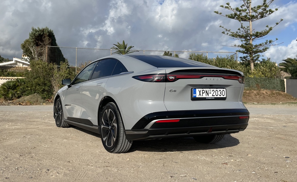 Το Mazda 6e αποτελεί μια όμορφη ηλεκτρική μπερλίνα με κομψές και ρέουσες γραμμές, ενώ το τελείωμα της οροφής προσδίδει ένα περισσότερο κουπέ χαρακτήρα.