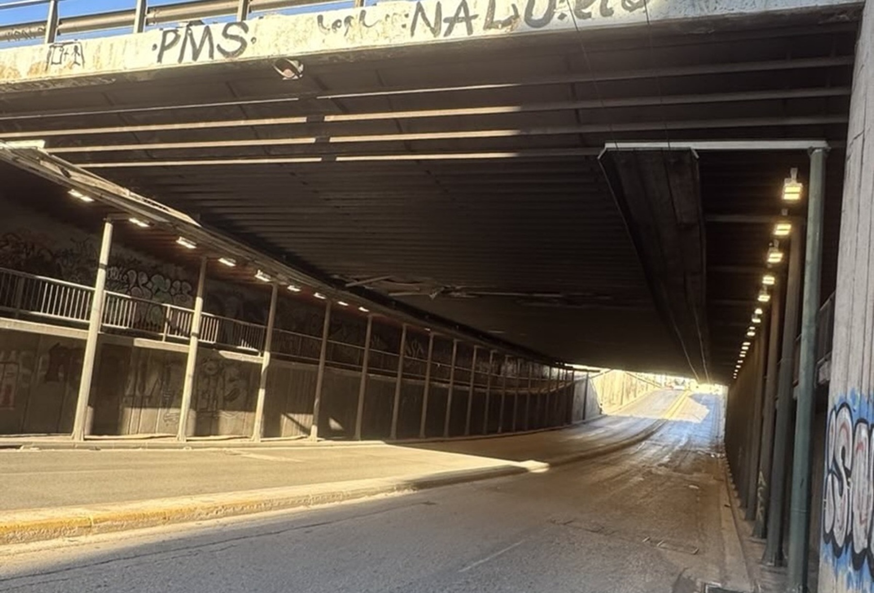 Μάλιστα η οροφή που μάλλον έχει ξηλωθεί από κάποιο φορτηγό που πέρασε κάτω από την γέφυρα άφησε την «υπογραφή» του έχει προκαλέσει σοβαρές υλικές ζημιές με αποτέλεσμα από στιγμή σε στιγμή να είναι πιθανή η αποκόλληση τμημάτων της οροφής στο οδόστρωμα προκαλώντας τροχαίο ατύχημα ή ακόμη και τον τραυματισμό οδηγών αυτοκινήτων ή δίκυκλων ή ακόμη και πεζών.