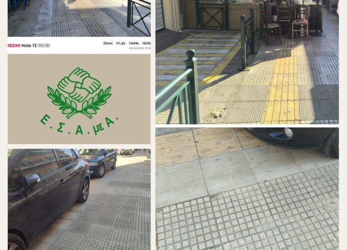 Να σημειωθεί ότι στην απάντηση του Α.Τ. δεν αναφέρονται η ημέρα και ώρα ελέγχου που πραγματοποιήθηκε ο έλεγχος. Επιπλέον, στις 2.3.2026 και κατόπιν της απάντησης του Α.Τ., πραγματοποιήθηκε επιτόπιος έλεγχος από εκπροσώπους του αναπηρικού κινήματος και διαπιστώθηκε ότι οι οδηγοί όδευσης τυφλών σε όλο το μήκος της οδού Αγίας Λαύρας παραμένουν κατειλημμένοι από τα τραπεζοκαθίσματα των καταστημάτων και από παρκαρισμένα οχήματα. Η Άμεση Δράση κλήθηκε δύο φορές αλλά κανένα περιπολικό δεν εμφανίστηκε να καταγράψει την παράβαση.