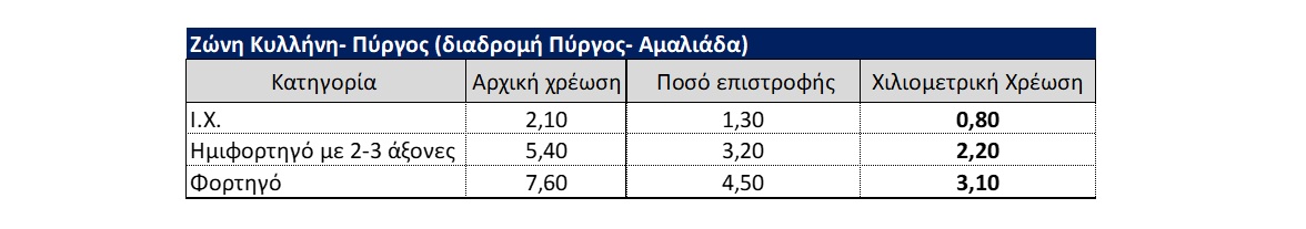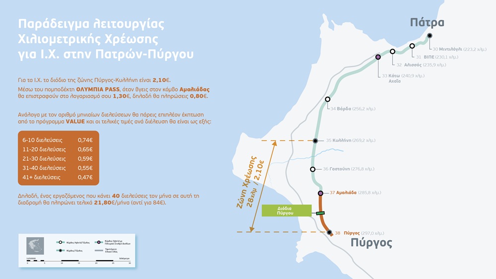 Από την Παρασκευή 20 Μαρτίου 2026 επεκτείνεται η χιλιομετρική χρέωση στην Πατρών-Πύργου, καθώς τίθενται σε λειτουργία οι πύλες και στον κόμβο Αμαλιάδας, εξασφαλίζοντας για τα Ι.Χ. οχήματα μείωση της τάξης του 62%. Η Ολυμπία Οδός έχει εφαρμόσει τη Χιλιομετρική Χρέωση από το 2021 στο τμήμα Ελευσίνα-Κόρινθος-Πάτρα για όλους, Ι.Χ. και επαγγελματικά οχήματα, και τώρα εφαρμόζει το σύστημα σταδιακά στην Πατρών-Πύργου.