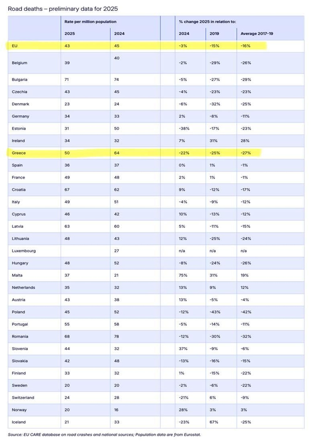 Την ίδια στιγμή, ο ευρωπαϊκός μέσος όρος καταγράφει μείωση μόλις 3%, με τη χώρα μας να καταγράφει μία από τις καλύτερες επιδόσεις, πίσω μόνο από την Εσθονία. Η εξέλιξη αυτή έρχεται να επιβεβαιώσει, με επίσημα ευρωπαϊκά δεδομένα, τη σημαντική πρόοδο που καταγράφηκε το 2025, χρονιά κατά την οποία η Ελλάδα σημείωσε τη μεγαλύτερη μείωση θανάτων από τροχαία στην ιστορία της, με 517 θανάτους έναντι 665 το 2024, δηλαδή μείωση 22%. Ο αριθμός αυτός είναι ταυτόχρονα και ο χαμηλότερος από το 1963 για τη χώρα μας.