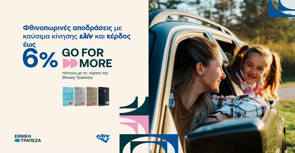 Από την Παρασκευή 24 έως και την Τρίτη 28 Οκτωβρίου, επισκεφθείτε τα, συνεργαζόμενα με το πρόγραμμα Go For More, πρατήρια ελίν, πραγματοποιήστε τις αγορές σας με κάρτες της Εθνικής Τράπεζας και κερδίστε επιπλέον Go For More πόντους στα καύσιμα κίνησης ελίν: